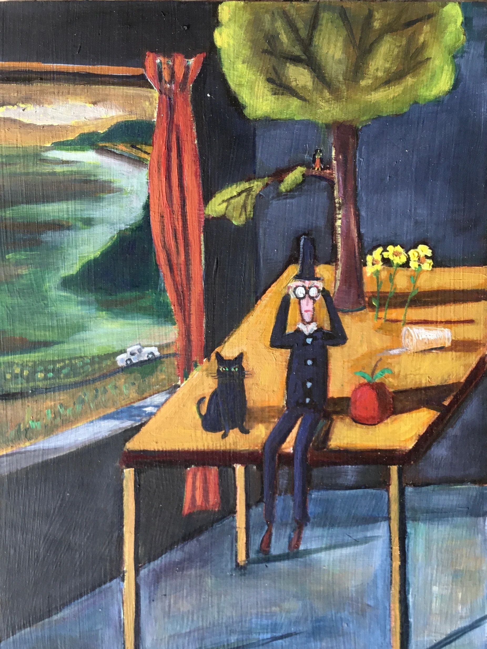 BIRD WATCHING WITH CAT 6x8 oil on board $195