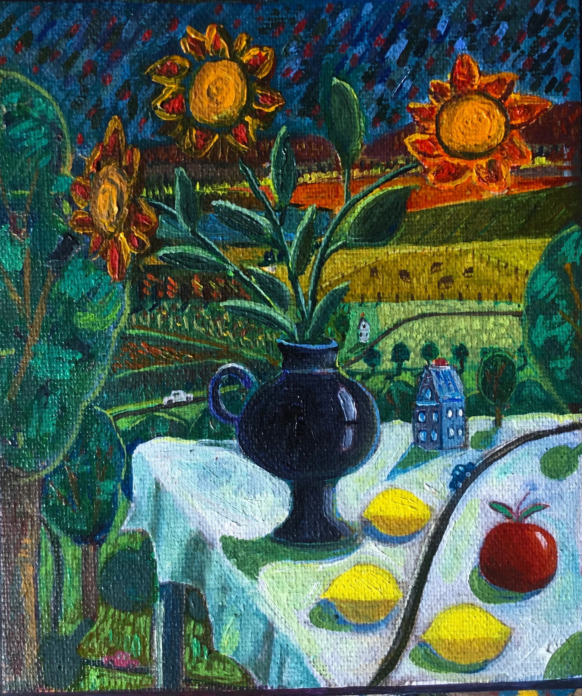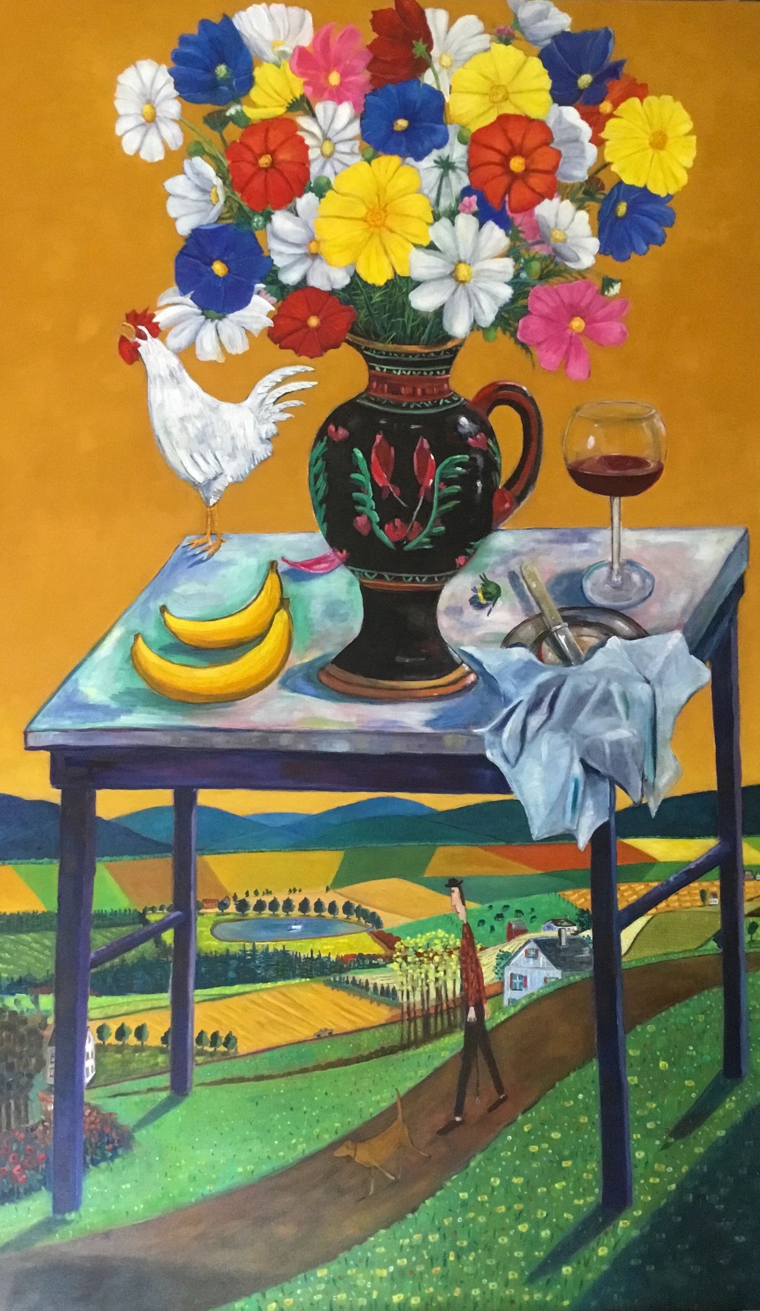COUNTRY SCENE WITH BLUE VASE